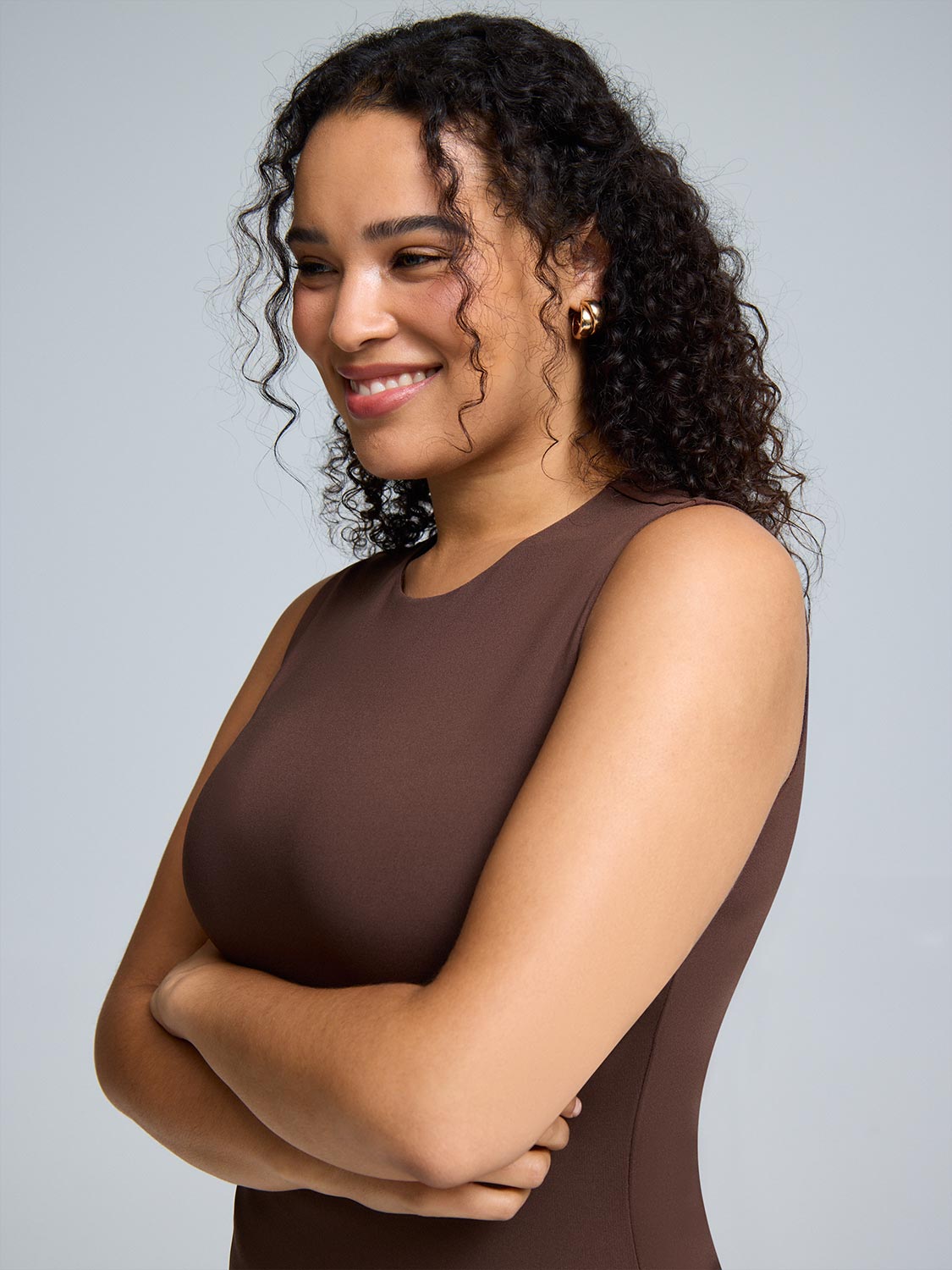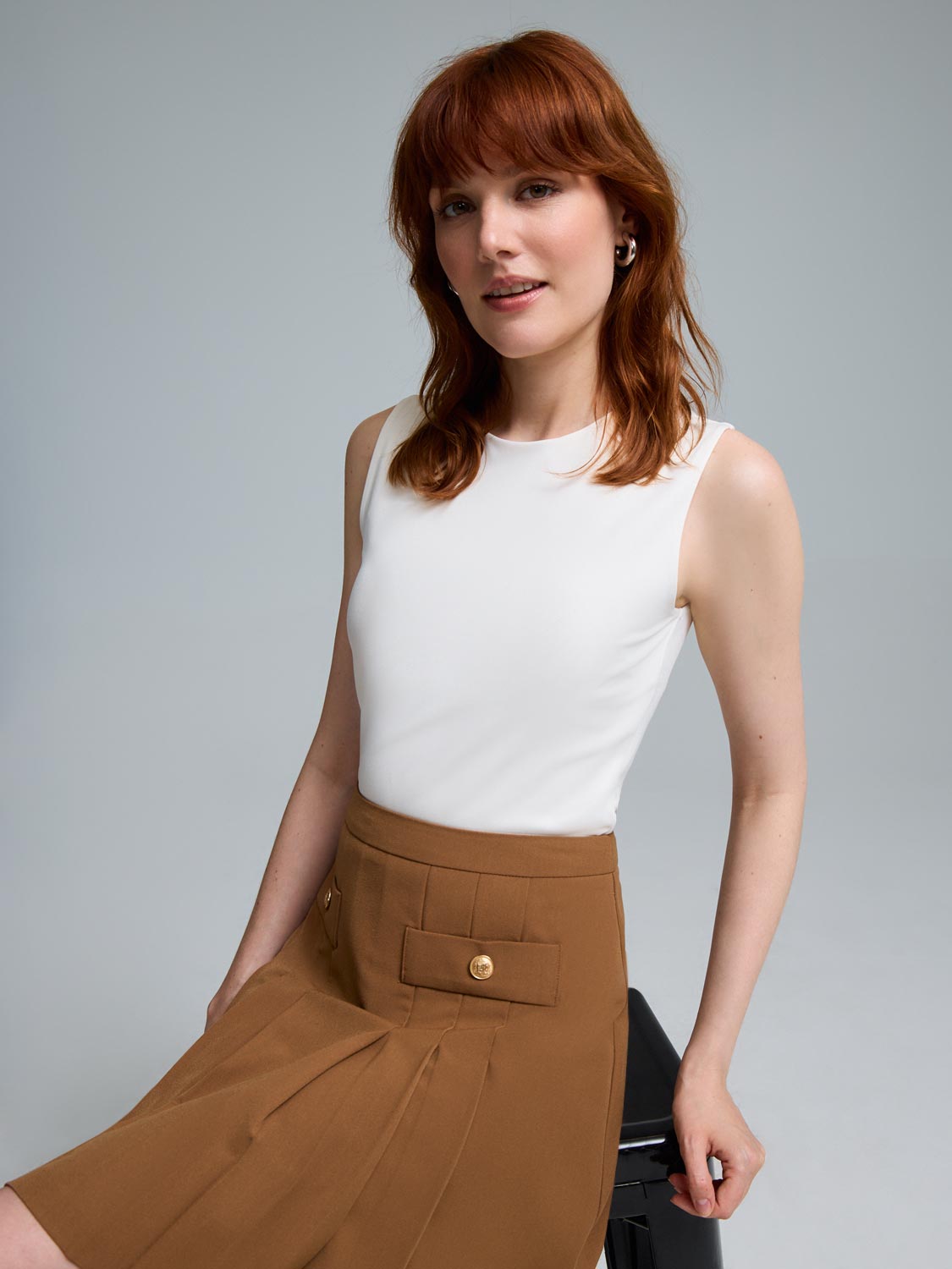 Our double layer high neck tank top offers the perfect styling option for layering or wearing alone.Knit top Silhouette Sleeveless Very soft stretch Jersey High neck Double layer Model is wearing size XS Fabric: 92% nylon, 8% spandex Machine wash in cold water Hang to dry