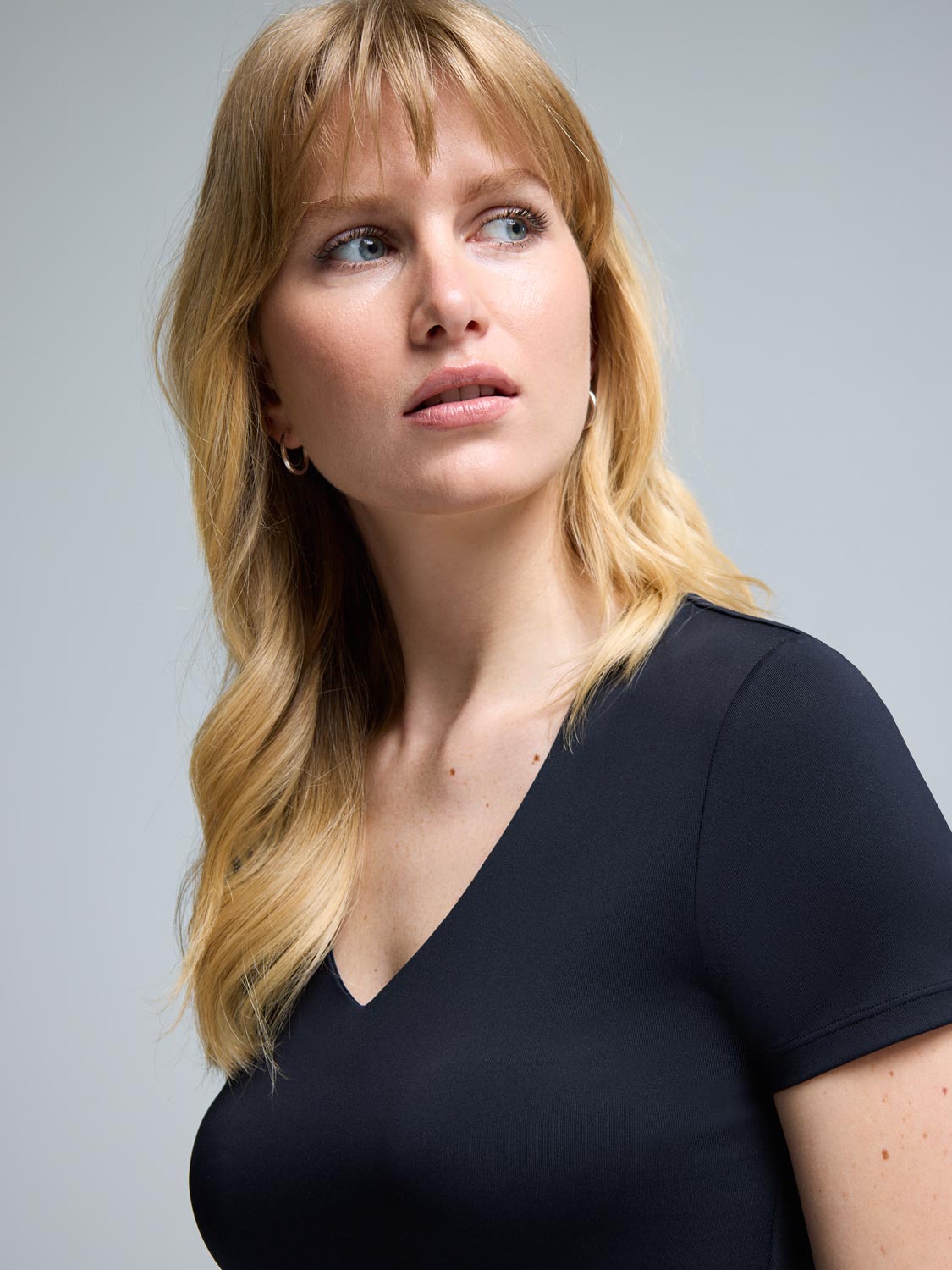 Our double layer V-neck t-shirt offers the perfect styling option for layering or wearing alone.